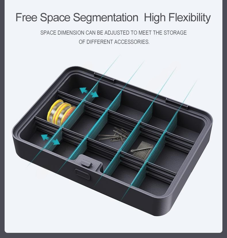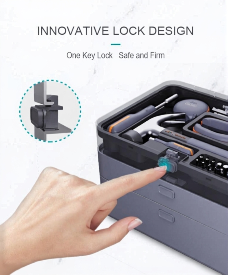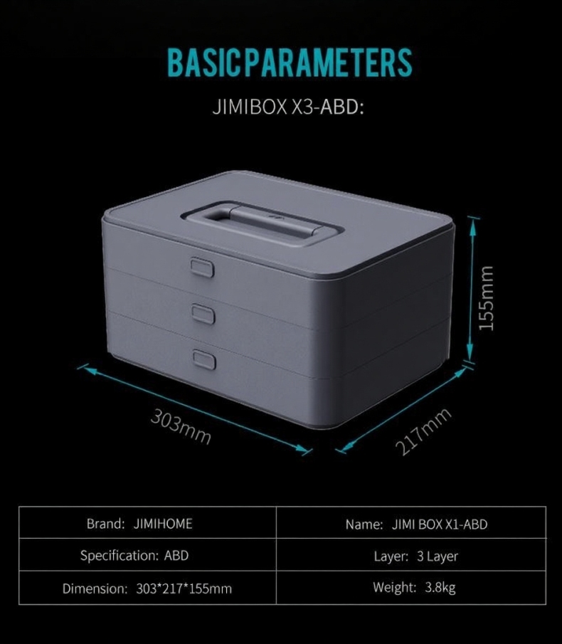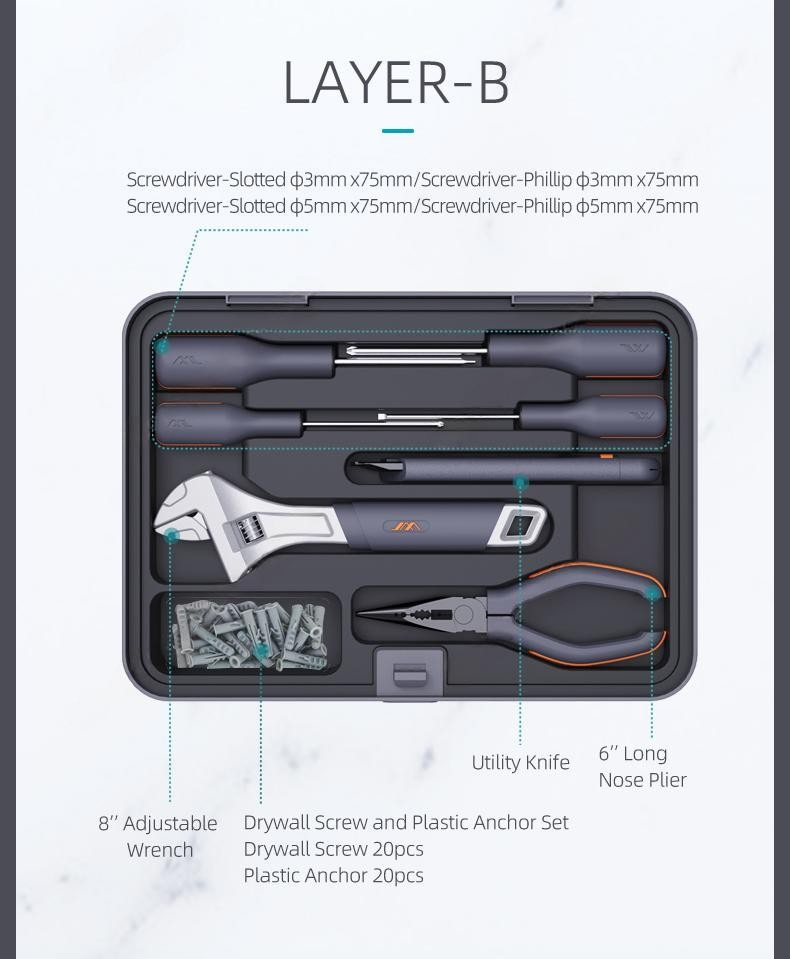 Набор инструментов JIMIBOX X3-ABD размещен в аккуратно оформленном трехуровневом кейсе и включает в себя удлинённую ручку отвёртки, короткую ручку отврётки, измерительную рулетку длинной 3,5 м, молоток-гвоздодёр, кусачки, биты, набор шестиграников, разводной ключ, плоскогубцы с заострённым носом, универсальный нож, минусовую отвёртку, крестовую отвёртку, винты, дюбели и перегородки. Набор отлично подойдёт как для домашнего ремонта, так и для профессиональных работ. Данный кейс отличается простым и элегантным дизайном, а его конструкция позволяет эффективно активировать блокировку - всего одним нажатием кнопки. Размеры кейса составляют 303 мм х 217 мм х 155 мм, а вес всего 3,8 кг, также кейс оснащён специальной практичной ручкой для большего удобства при перемещении. Максимальный вес, который может выдержать ручка, составляет 15 кг, что гарантирует безопасность при транспортировке инструментов, сам корпус изготовлен из высококачественного материала, который отличается прочностью и устойчивостью к износу.