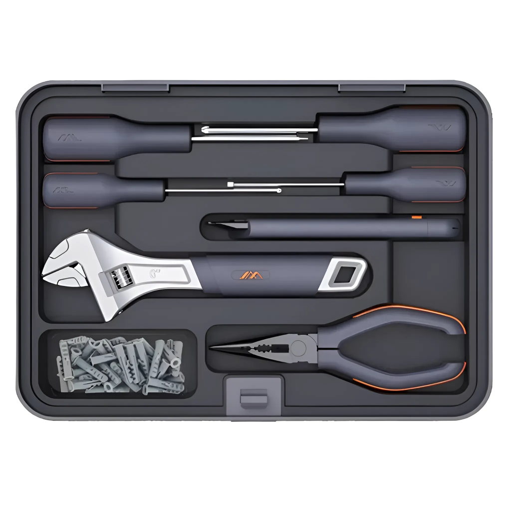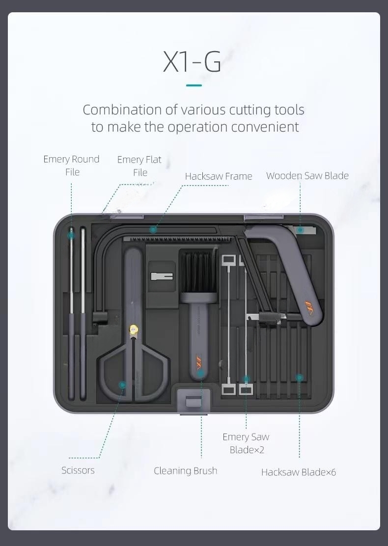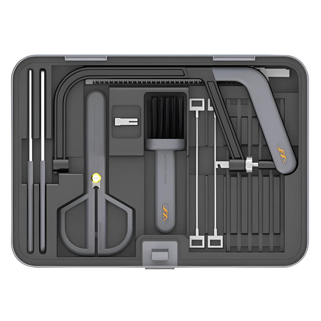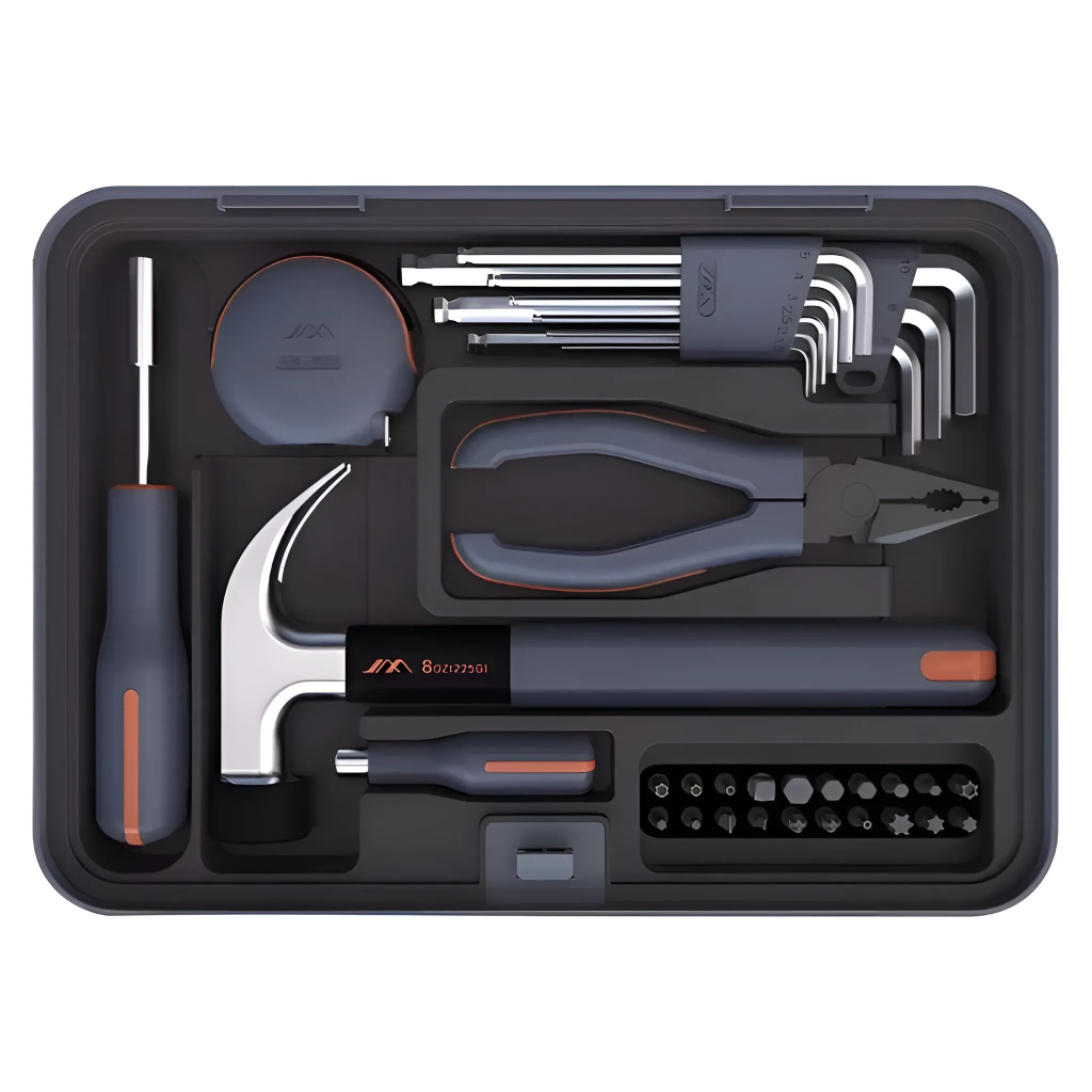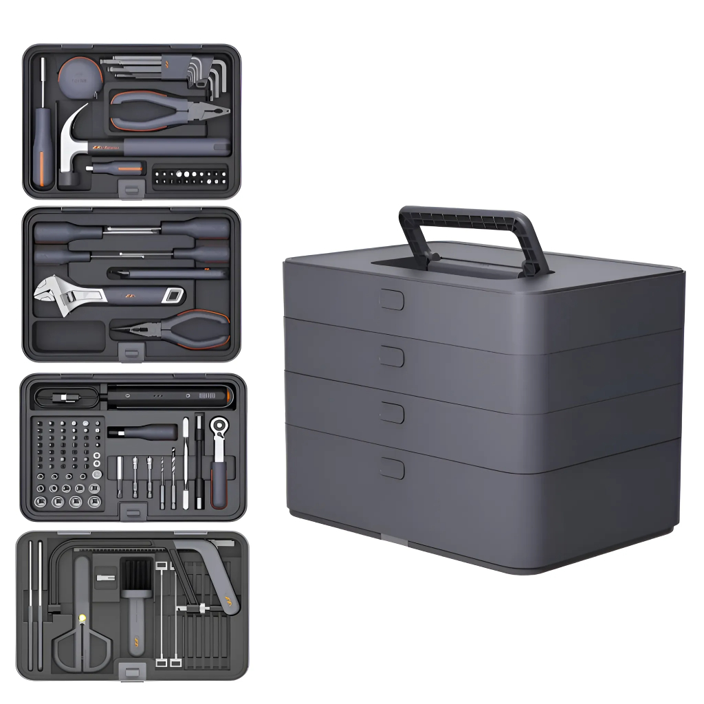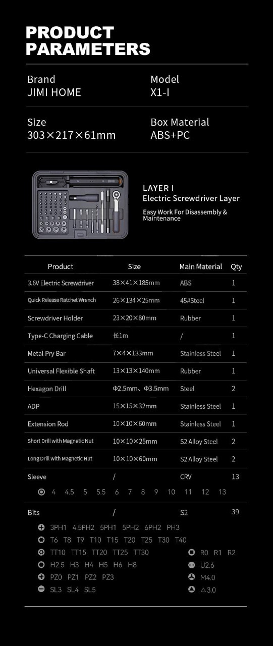 Набор инструментов JIMIBOX X4-ABGI размещен в аккуратно оформленном четырёхуровневым кейсе и включает в себя все необходимые рабочие инструменты. Отделение 1 включает в себя удлинённую ручку отвёртки, короткую ручку отвёртки, измерительную рулетку на 3,5 метра, молоток-гвоздодёр, кусачки, биты 25 мм х 5 мм 20 штук и набор шестигранников из 9 штук. Отделение 2 включает в себя разводной ключ, плоскогубцы с заострённым носом, универсальный нож, минусовую отвёртку 155 мм х 3 мм, крестовую отвёртку 155 мм х 3 мм, минусовую отвёртку 175 мм х 5 мм и крестовую отвёртку 175 мм х 5 мм. Отделение 3 включает в себя спиральную пилу, пилу с алмазным напылением, напильник с алмазным напылением, пилу для древесины, ножницы, щётку для уборки опилок. Отделение 4 включает в себя аккумуляторную отвёртку, короткую фрезу с магнитной гайкой, длинную фрезу с магнитной гайкой, шестигранное сверло 2,5 мм, шестигранное сверло 3,5 мм, универсальный гибкий вал, удлинитель, металлическая монтировка, втулка CKV, набор бит из 39 штук, зарядная подставка и USB адаптер питания.