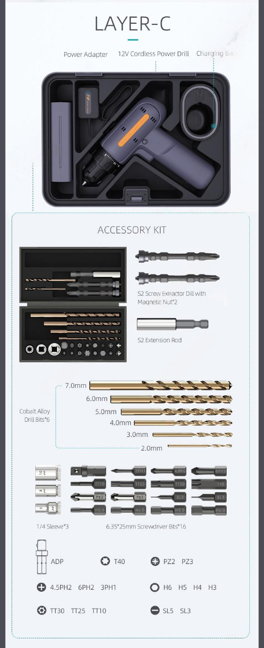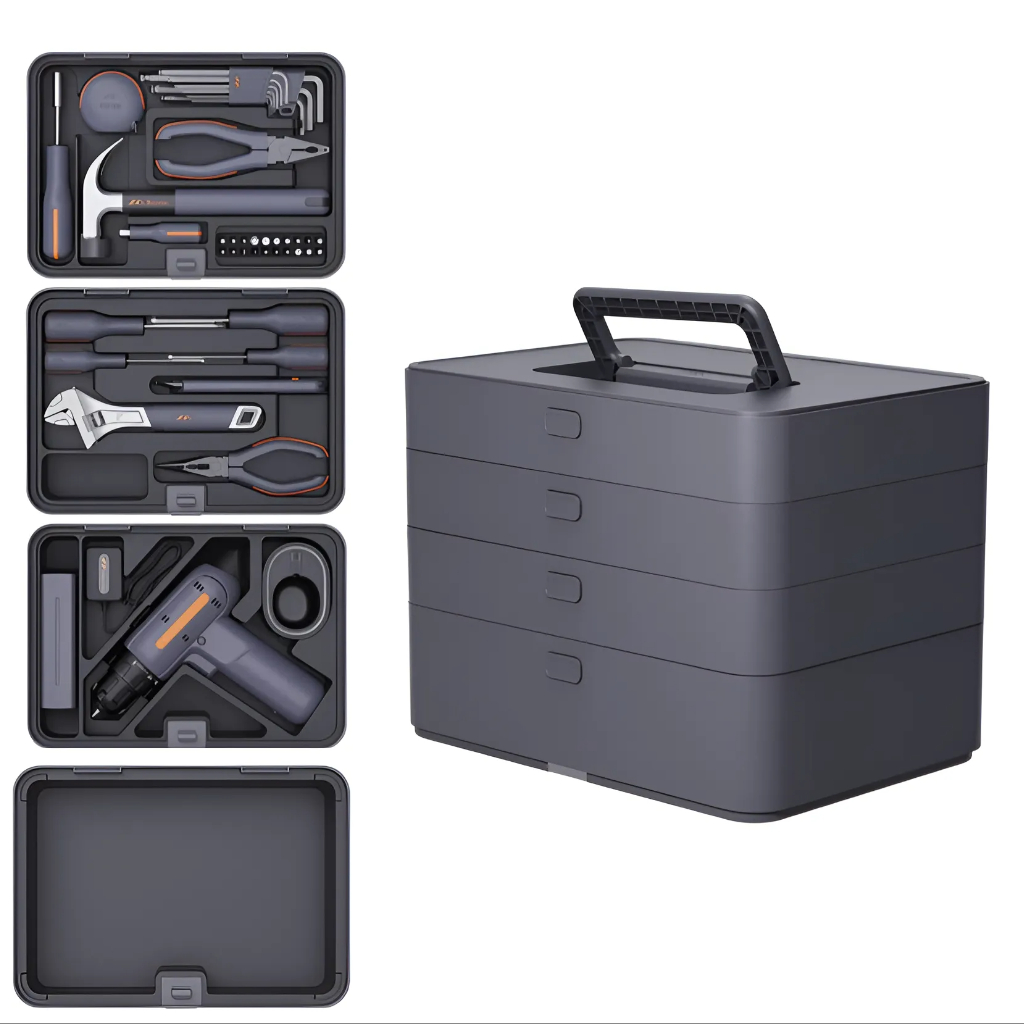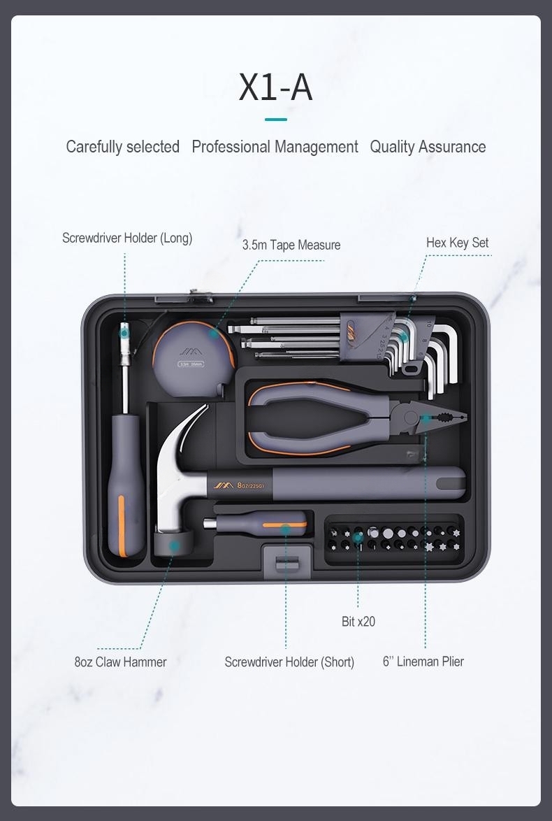 Набор инструментов JIMIBOX X4-ABCE размещен в аккуратно оформленном четырёхуровневым кейсе и включает в себя все необходимые рабочие инструменты. Отделение 1 включает в себя удлинённую ручку отвёртки, короткую ручку отвёртки, измерительную рулетку на 3,5 метра, молоток-гвоздодёр, кусачки, биты 25 мм х 5 мм 20 штук и набор шестигранников из 9 штук. Отделение 2 включает в себя разводной ключ, плоскогубцы с заострённым носом, универсальный нож, минусовую отвёртку 155 мм х 3 мм, крестовую отвёртку 155 мм х 3 мм, минусовую отвёртку 175 мм х 5 мм и крестовую отвёртку 175 мм х 5 мм. Отделение 3 включает в себя биты 25 мм х 6,35 мм 16 штук, свёрла с магнитом для извлечения винтов, удлинитель для отвёртки, стандартное сверло, шестигранные головки, электрическую дрель, зарядную станцию и адаптер питания. Отделение 4 включает в себя габаритный кейс для хранения различных инструментов.