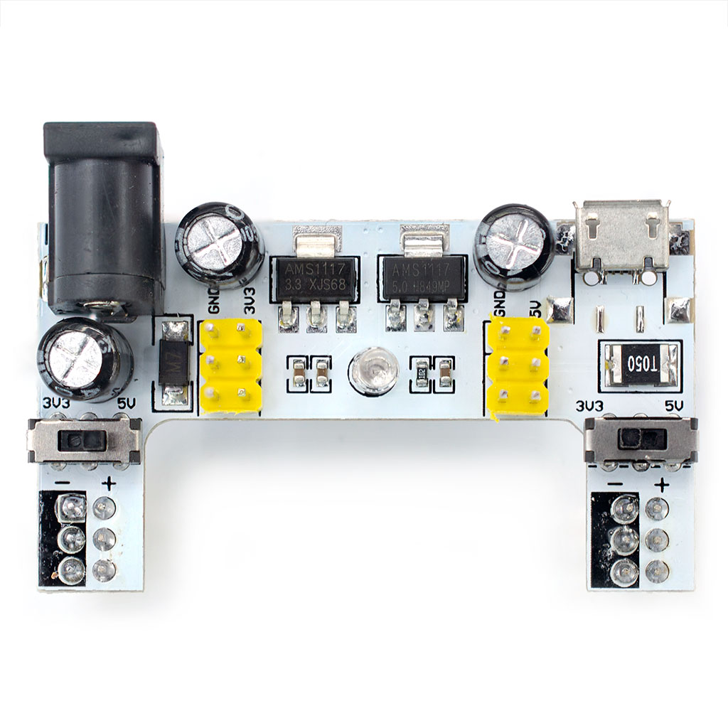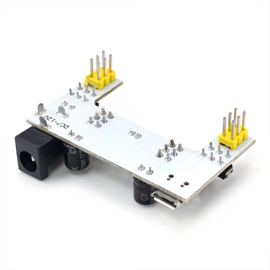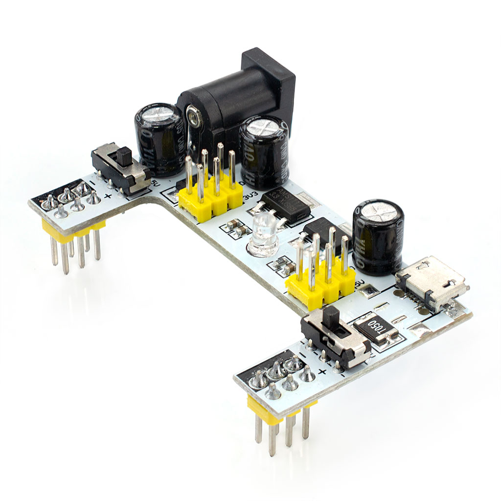 Вы можете купить Модуль питания платы беспаечной MB102. Питание: 6,5-12В от внешнего источника или 5В от microUSB. Выходное напряжение: 3,3В и 5В (переключателями, на каждый выход). Макс.ток: 700мА. Встроенная стабилизация напряжения. Дополнительно по 3 вывода для каждого как за наличный расчёт, так и по безналичному расчёту ( т.н. безналу, перечислению).
