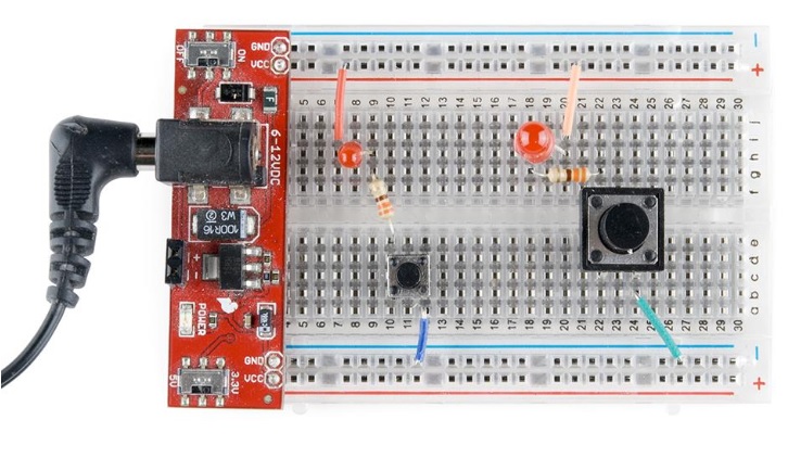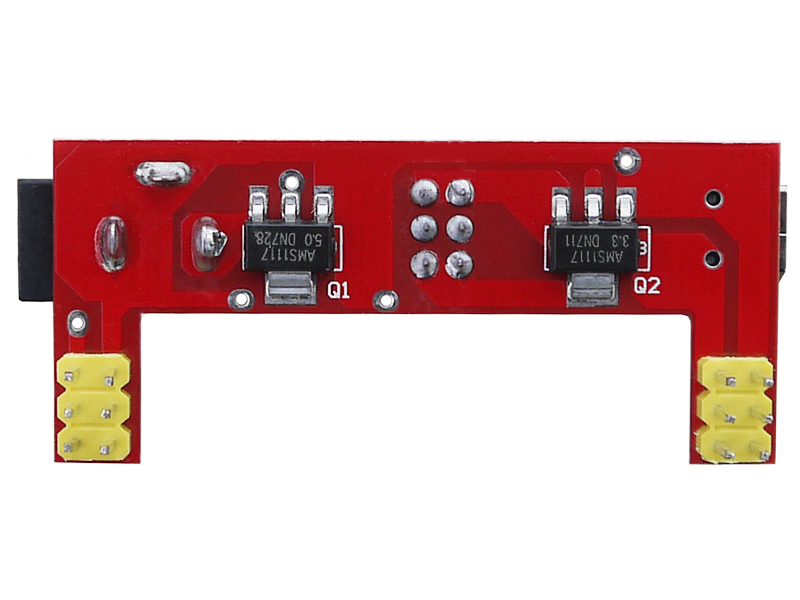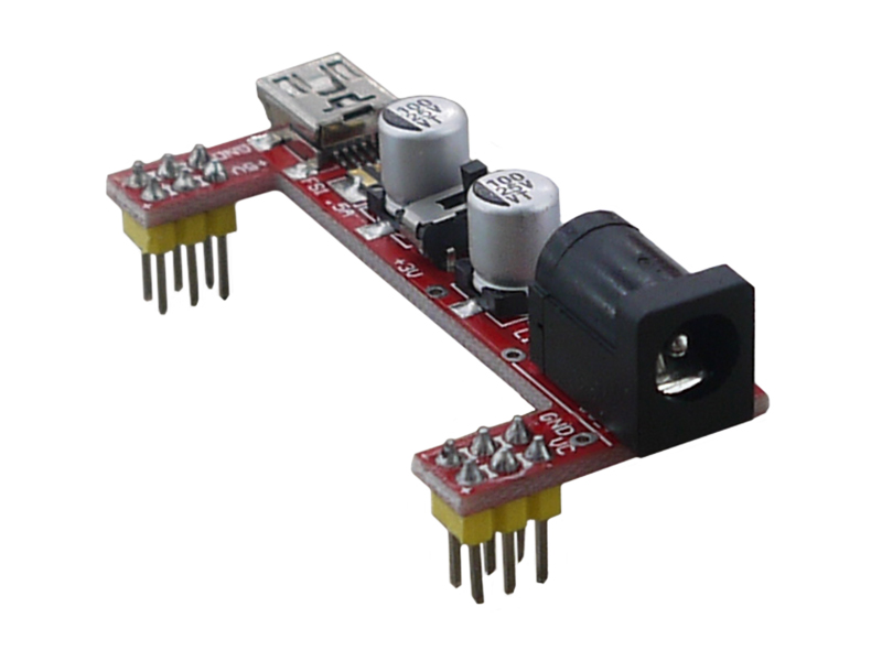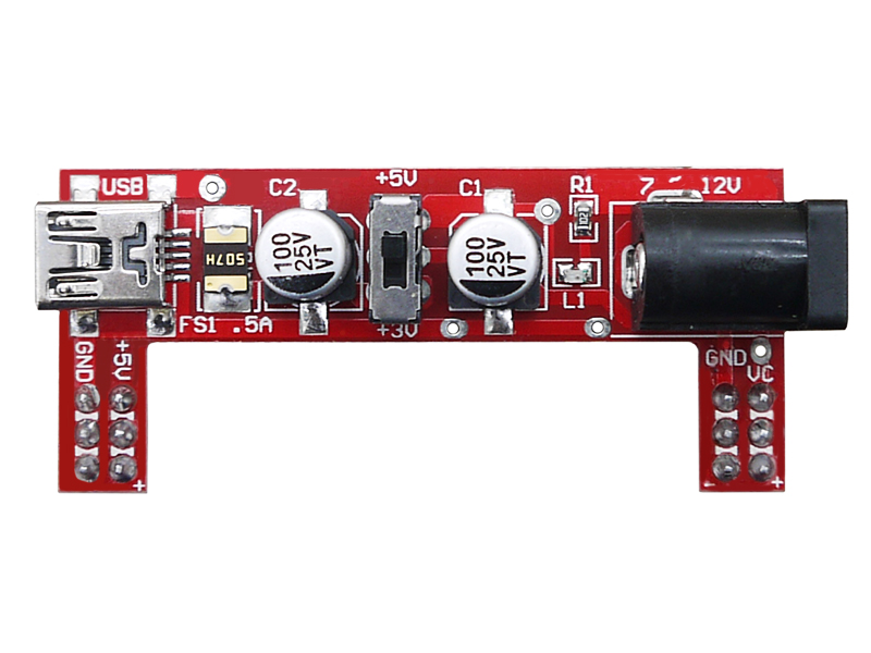 Модуль питания платы беспаечной MB102. Питание: 6,5-12В от внешнего источника или 5В от miniUSB. Выходное напряжение первого выхода: 3,3В и 5В (переключателем), второго выхода: 5В. Макс.ток: 500мА. Встроенная стабилизация напряжения. Цвет платы: красный.