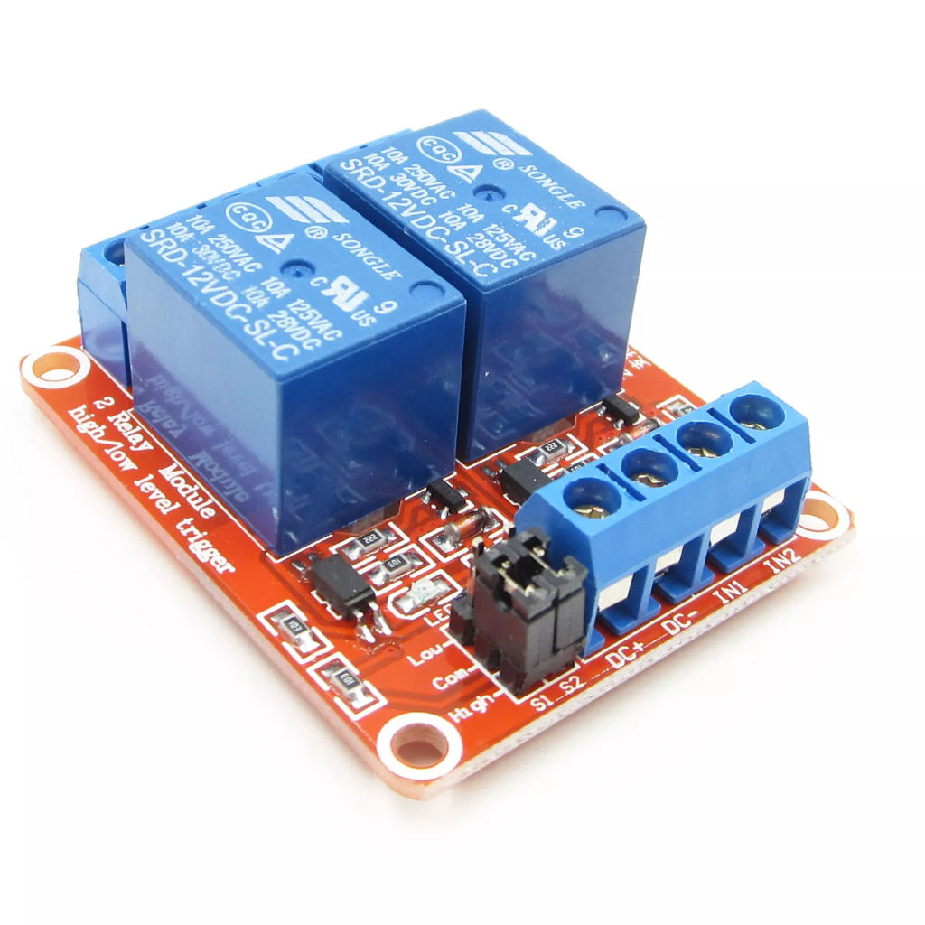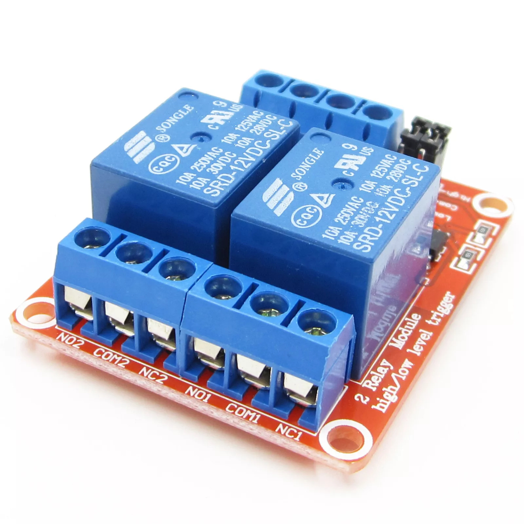 Модуль реле на 2 канала с опторазвязкой. Обеспечивает более защищенное управление нагрузкой. Переключатель уровня TTL на каждый канал. Питание 12 В.
