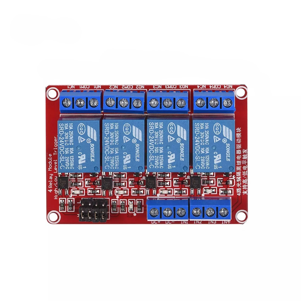 Модуль реле на 4 канала с опторазвязкой. Обеспечивает более защищенное управление нагрузкой. Переключатель уровня TTL на каждый канал. Питание 24 В.