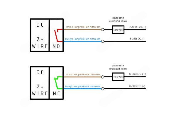 Существуют двухпроводные индуктивные датчики приближения с нормально открытым контактом (NO) или нормально закрытым контактом (NC). Характеристика "нормально открытый" соответствует датчику, замыкающему оба входа цепи нагрузки в момент срабатывания и размыкающему оба входа в случае отсутствии условий для срабатывания. Принцип работы "нормально закрытого" датчика полностью противоположен - он размыкает цепь нагрузки при срабатывании и замыкает её в ином состоянии.