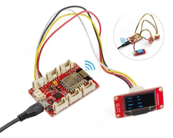 Погодная станция Elecrow Crowtail ESP8266 IOT Weather Station использует модули серии Crowtail, оснащённые разъёмами для простого соединения между собой. Датчик DHT11 измеряет одновременно температуру и влажность, имеет выход с цифровым сигналом. Датчик капель и дождя определяет наличие в воздухе влажных атмосферных осадков. Датчик освещения реагирует на яркость дневного света в ясную или пасмурную погоду, на утренние и вечерние сумерки. Все эти данные обрабатываются одной платой IOT ESP8266 и передаются на другую плату IOT ESP8266 с подключенным OLED-дисплеем.