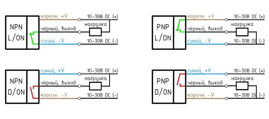Фотоэлектрические датчики светопрерывания с 3-проводным интерфейсом имеют различную внутреннюю транзисторную структуру и подключаются по одной из четырёх представленных схем. Выбор правильной схемы зависит от полярности напряжения на выходе датчика в моменте его срабатывания: PNP (плюсовая) или NPN (минусовая). Поддерживается работа в двух режимах: LIGHT-ON и DARK-ON, с разными вариантами коммутации питания датчика. Режимами L/ON и D/ON определяются правила переключения выхода датчика, аналогично понятиям "нормально открытый (NO)" и "нормально закрытый NC". Замыкание цепи напряжения питания минусовой (NPN) или плюсовой (PNP) полярности с внешней нагрузкой выполняется при условии отсутствия объекта в области детекции для режима LIGHT-ON, а в режиме DARK-ON — напротив, при условии присутствия объекта в области детекции.