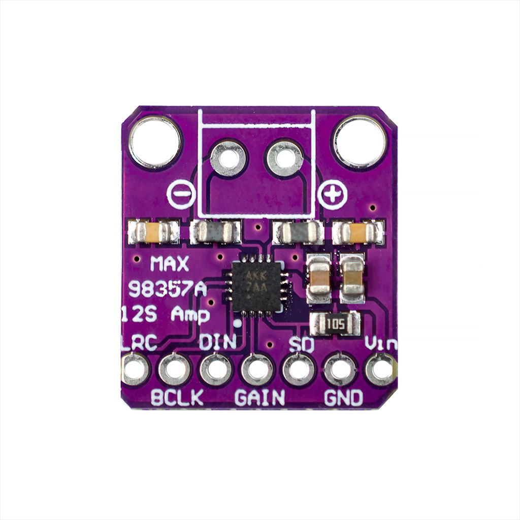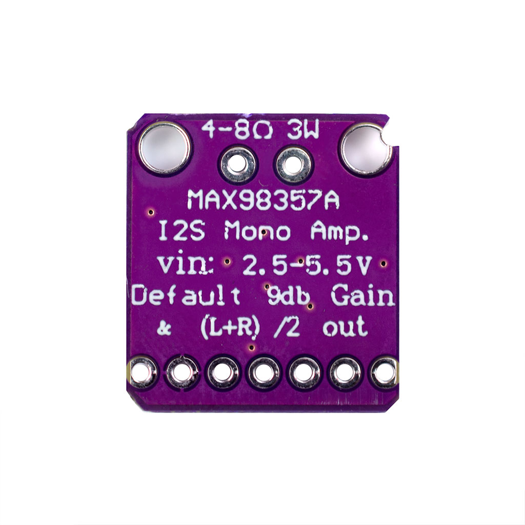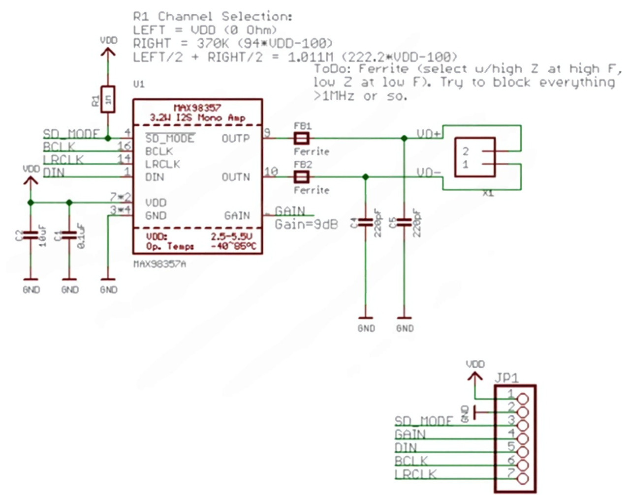 В модуле применены звуковой ЦАП MAX98357 I2S со встроенным 3Вт усилителем D-класса. ЦАП подключается к микроконтроллеру при помощи цифрового интерфейса I2S. I2S цифровой интерфейс, используемый в профессиональной звуковой технике и поддерживается большим количеством специализированных микросхем. Для подключения используется 4 сигнальных провода (data in, data out, bit clock и выбор канала left-right). Обычно, аудиоустройства самостоятельно преобразуют входящие данные и конвертируют их в аналоговых сигнал, который можно непосредственно подавать на наушники или линейный вход усилителя.