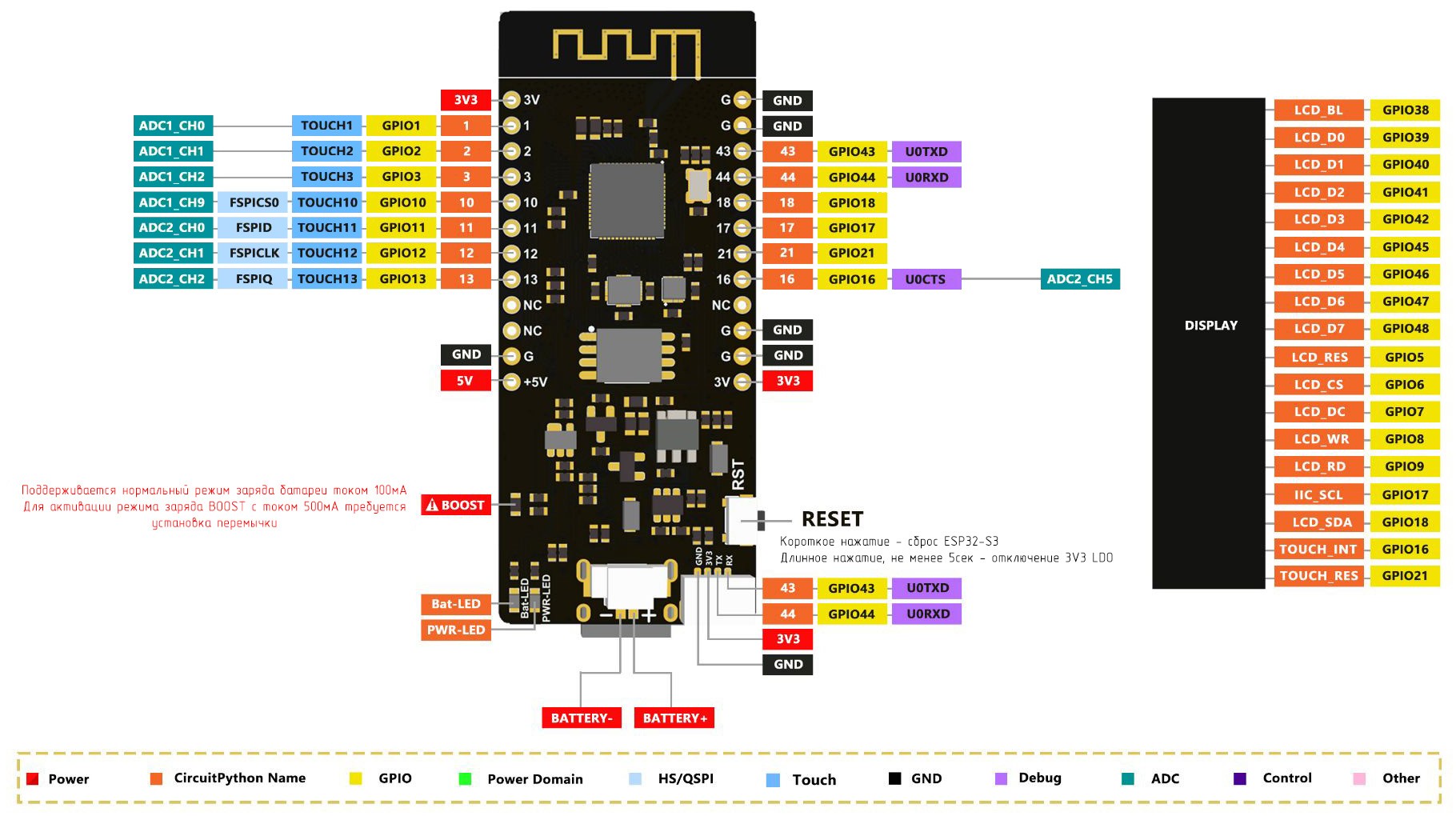 В основе модуля Lilygo T-Display S3 Enhanced используется 2-ядерный 32-разрядный процессор ESP32-S3 с архитектурой Xtensa LX7 и тактовой частотой 240МГц, со встроенными интерфейсами беспроводной связи 2.4ГГц WiFi-4 + Bluetooth 5.0/BLE. Чип ESP32-S3 объединяет с собой большой объём памяти 16МБ и PCB-антенну, к нему подключен яркий цветной дисплей с матрицей IPS TFT размером 1.9 дюйма и графическим разрешением 320 х 170 пикселей. Несъёмный дисплей надёжно закреплён в пластиковой рамке, приклеенной к плате специальным компаундом. Взаимодействие в части управления системой питания модулем и режимами загрузки ESP32-S3 организовано пользовательскими кнопками. Нативный USB-порт контроллера ESP32-S3 предусматривает опции обновления ПО и последовательной коммуникации в режимах USB OTG, USB Serial / JTAG и USB DFU без помощи внешних USB-TTL преобразователей. Поддержка автономной работы Lilygo T-Display S3 ESP32 Enhanced обеспечивается коннектором внешней аккумуляторной батареи в паре с микросхемой контроллера заряда-разряда, подпитывающей током 100мА по умолчанию или 500мА в ускоренном режиме (требуется установка аппаратной перемычки). Свободные порты ESP32-S3 располагаются по краям платы с её обратной стороны, комбинируют многочисленные интерфейсы ESP32, позволяют контактировать с подходящим оборудованием или расширениями. В качестве приятного бонуса ко всему арсеналу на плату инсталлирован коннектор Qwiic, привносящий Lilygo T-Display S3 ESP32 Enhanced дополнительную сочетаемость с одноимённой системой соединения, разработанной производителем электроники SparkFun.