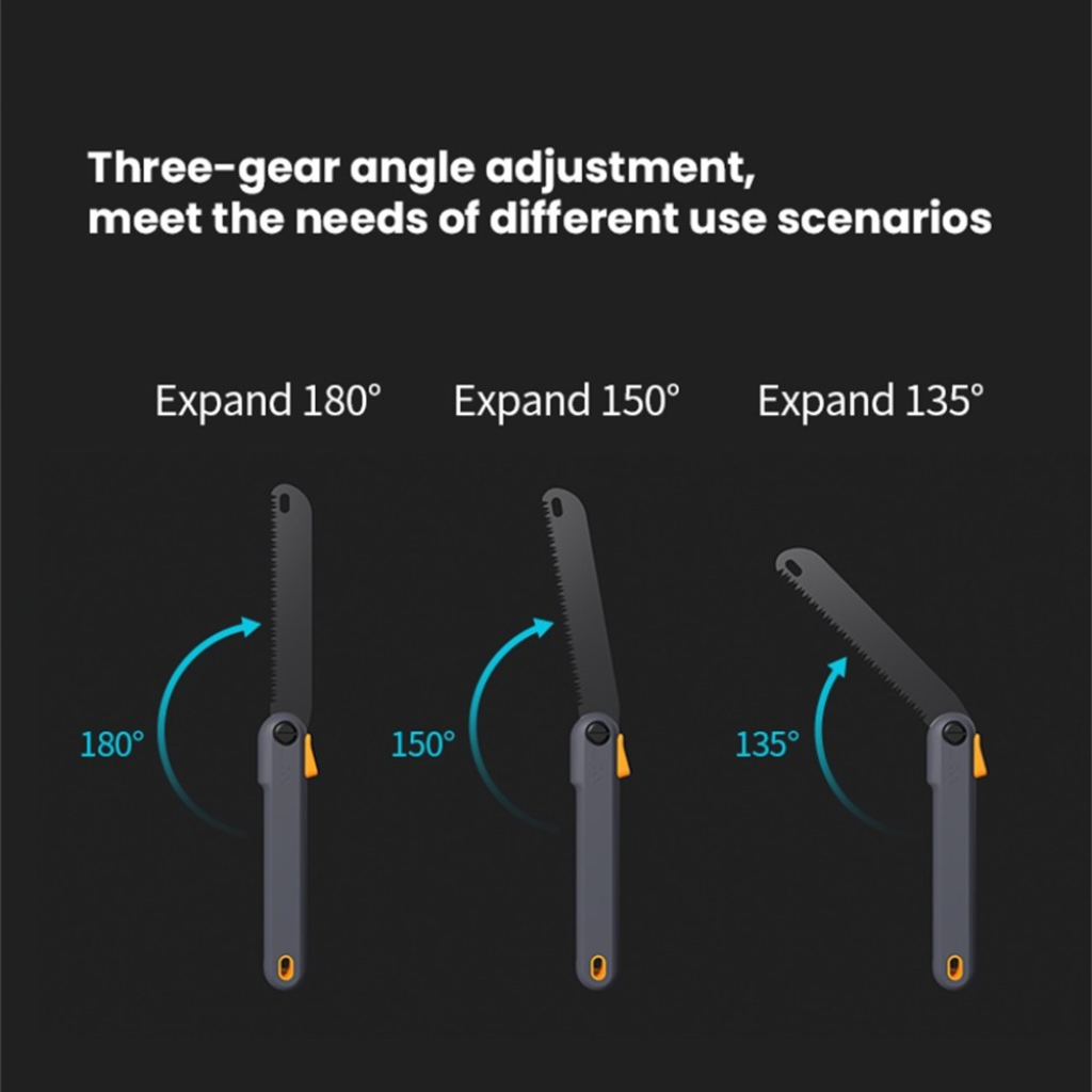 Пила имеет три фиксированных положения в раскрытом состоянии под углами 135, 150 и 180 градусов.