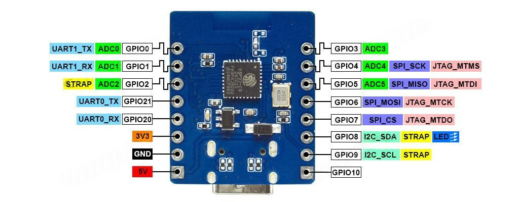 | TX | Ввод-вывод | GPIO21 Контакт общего назначения ESP32-C3 Интерфейс UART0 канал исходящих данных TXD |