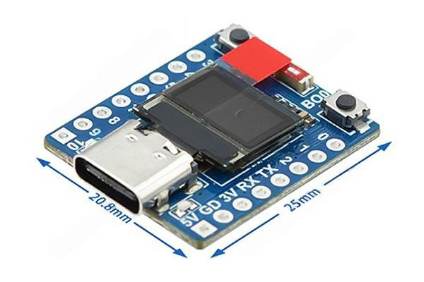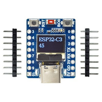 Модуль разработчика ESP32-C3 0.42 OLED Mini выполнен в суперкомпактном формате с двусторонним расположением электронных компонентов. Кроме контроллера ESP32-C3 на плате установлены керамическая антенна WiFi/BT, миниатюрный монохромный OLED-дисплей с диагональю 0.42 дюйма, два цветных световых индикатора и разъём USB Type-C. Кнопки ручного управления RESET и BOOT предоставляют соответствующие опции полного сброса ESP32-C3 и активации режима загрузки через USB-подключение для обновления программного обеспечения. USB-порт платы ESP32-C3 Supermini функционирует в режиме CDC-ADC, с автоматической эмуляцией виртуального последовательного порта в ОС Windows 10+ (для ОС Windows 8.1 и более ранних выпусков может потребоваться драйвер). Чип ESP32-C3 оперирует логическими сигналами уровня 3.3В. Плата разработчика ESP32-C3 0.42 OLED Mini DevBoard питается напряжением 3.3-6В от стационарного источника энергии или от батареи. Максимальный пропускной ток встроенного 3.3-вольтового LDO-регулятора составляет 500мА.