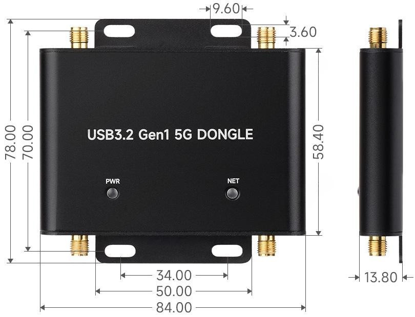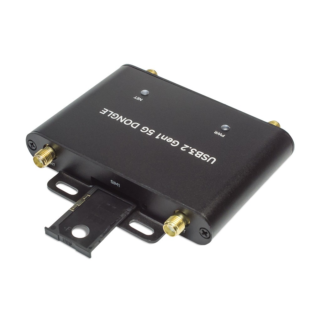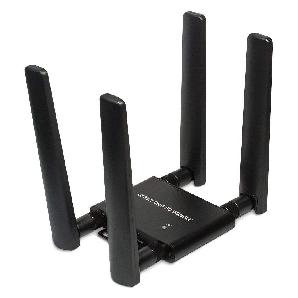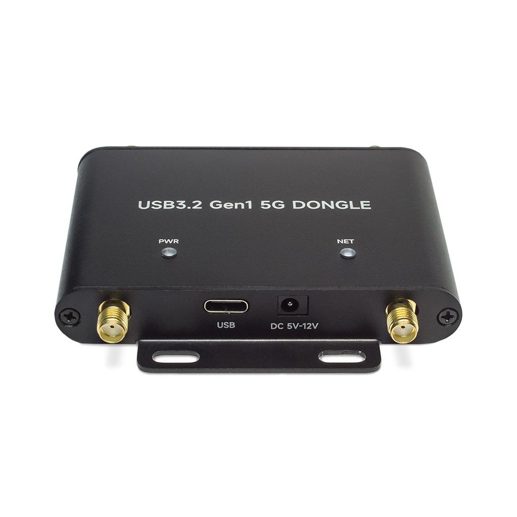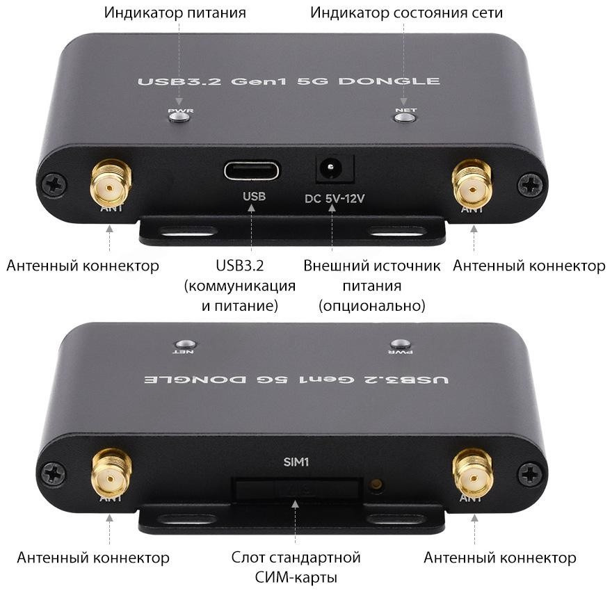 Стабильное и надежное беспроводное соединение в сетях 5G / LTE обеспечивается специальным дизайном устройства с 4-мя внешними антеннами 5G RPSMA. Встраиваемый модуль сотовой связи Quectel RM520N-GL имеет форм-фактор M.2 Key-B. Несущая плата USB-донгла с ответным коннектором также совместима с другими радиомодулями серий SIM82XX, RM5XX и FM650XX с физическими размерами 3042/3052, выполненными в аналогичном форм-факторе. Абонентская идентификация предусматривается на выбор одной СИМ-картой Mini-SIM или eSIM через настройку ПО. Для отображения состояний нормального функционирования и сигналов сетевого соединения, на верхней части корпуса размещены два светодиодных индикатора. Модем 5G/4G оснащается портами DC35135 напряжения питания 9~12В и USB3.2 Gen 1 Type-C напряжения питания 5В / коммуникации с хост-системой.
