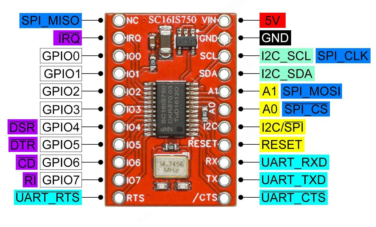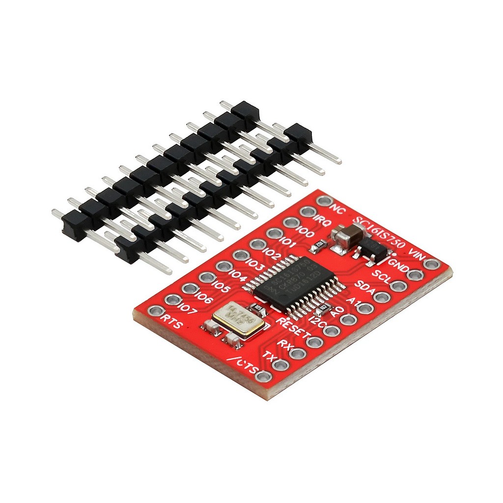 Плата с чипом SC16IS750 выполняет преобразование последовательных сигналов I2C/SPI и UART, позволяет объединять два устройства с подобными интерфейсами по одной из схем: I2C-bus<->UART или SPI<->UART. Преобразователь SC16IS750 комплектуется приёмо-передатчиком с FIFO-буфером на 64 байта, взаимодействие между ним и хост-системой, подключенной к плате по протоколу I2C/SPI, выстраивается в соответствии с моделью "ведущий-ведомый". Также SC16IS750 содержит 25+ программируемых регистров, управляющих множеством дополнительных полезных опций. К ним относятся: управление 8-ю пользовательскими цифровыми портами общего назначения, предназначенными для свободного использования (часть портов может быть задействована в функциях контроля за потоком), настройка уровней триггеров функции обратной связи, настройка функций аппаратного и программного управления потоком данным (CTS/RTS, Xon/XOff), настройка скорости связи для UART, настройка режима сна и др. Встроенный в SC16IS750 IrDA кодер/декодер поддерживает протокол IrDA SiR с максимальной скоростью трансляции 115.2 Кбит/с.