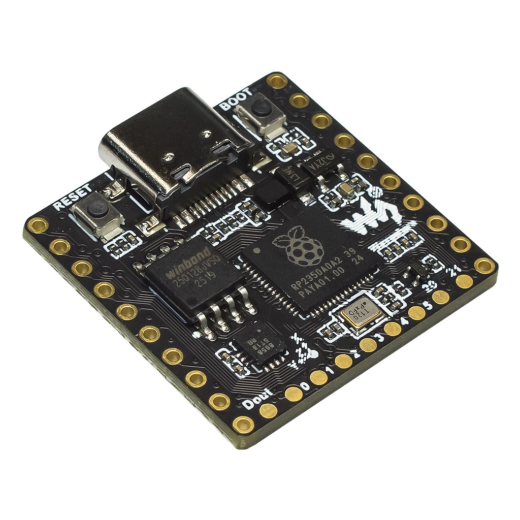 Модуль RP2350-Matrix оснащается инерционно-измерительным контроллером QMI8658 с интегрированными 3-осевым акселерометром и 3-осевым гироскопом, обеспечивающим приложение данными перемещения устройства в пространстве. Свободные порты общего назначения RP2350, объединяющие в себе цифровые последовательные и аналоговые интерфейсы, разведены по краям текстолита в форме 20 контактных отверстий и 8 контактных площадок. Они предназначены для расширения приложения или интеграции модуля в схемы других микроэлектронных устройств.