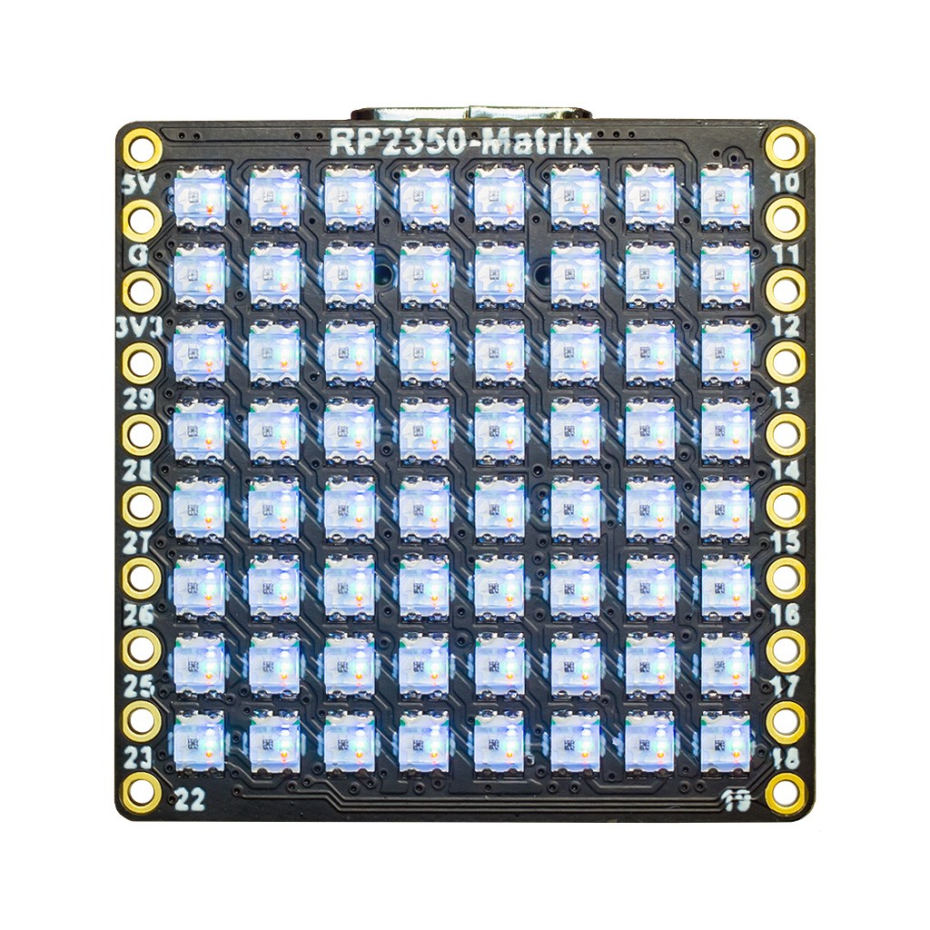 Оценочная плата Waveshare RP2350-Matrix — интересное и недорогое решение для разработки самых разных приложений робототехники или умного дома на базе современного программируемого микроконтроллера нового поколения RP2350A, спроектированного всемирно известным производителем электроники Raspberry Pi Foundation. Встроенная матрица из 64 адресных RGB-светодиодов WS2812B, подключенная к контроллеру платы RP2350-Matrix, позволяет реализовывать множество сценариев со световыми эффектами, используемыми в качестве визуальной обратной связи.