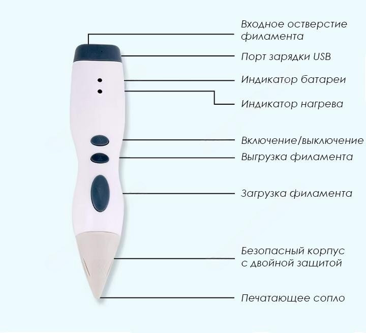 На корпусе 3D ручки располагаются три удобные кнопки управления. А также имеются два световых красно-зелёных индикатора, торцевое отверстие для вставки нити филамента и порт MicroUSB для подзарядки. Самая ближняя и самая крупная к соплу кнопка отвечает за подачу филамента. Средняя кнопка осуществляет выгрузку филамента через входное отверстие (обратный ход нити). Наиболее удалённой от сопла маленькой кнопкой 3Д ручка D10 просто включается или выключается. Функция регулировки скорости экструзии не предусмотрена.