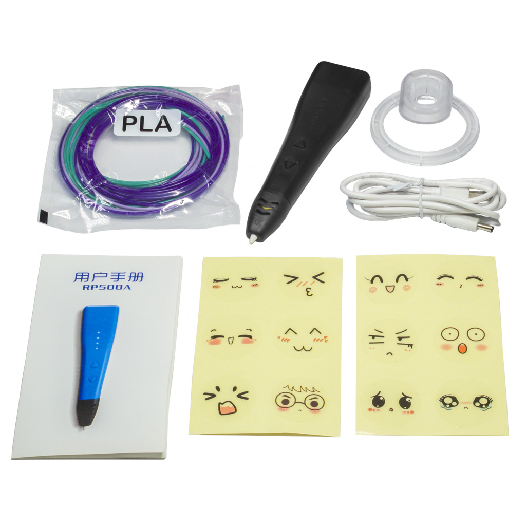 Ручка для 3Д-печати RP500A отличается от других моделей очень простым дизайном. У неё не предусмотрены ЖК-дисплей или звуковой индикатор, нет и прочих интересных "плюшек". Между тем, при отсутствии различных украшательств и улучшателей, эта ручка для 3Д-рисования в полной мере справляется со своей задачей, зато дешевле остальных. Она имеет стандартный набор функций, очень лёгкая (весит всего 45 грамм) и удобно держиться в руках. Кроме чёрного и белого вариантов корпусов, 3D-ручка выпускается ещё и в якро-голубом и сочно-оранжевом цветах. Управление ручкой трёхмерной печати RP500A реализовано 4-мя кнопками (под две с каждой стороны корпуса). Выбранные настройки отображаются в полосе светодиодного индикатора. Разобраться в их значении совершенно не сложно - это тип выбранного филамента PLA (зелёный) или ABS (красный) и три скорости печати (1-3 жёлтых). Поддерживаются опции выгрузки филамента на случай его замены на другой цвет или же окончания пользования ручкой, а также автоматическое переключение в состояние "сон" с реверсивным выбросом нитки загруженного филамента после 3-минутного "простоя". RP500A ручка 3Д-печати потребляет до 10Вт мощности, может полноценно работать не только от сетевого адаптера, но и от переносной батареи (пауэрбанка). В комплектацию к устройству входит дополнительный набор наклеек "эмодзи".
