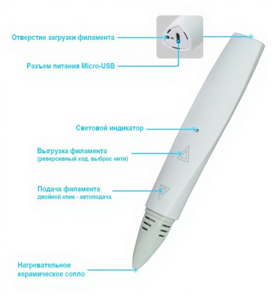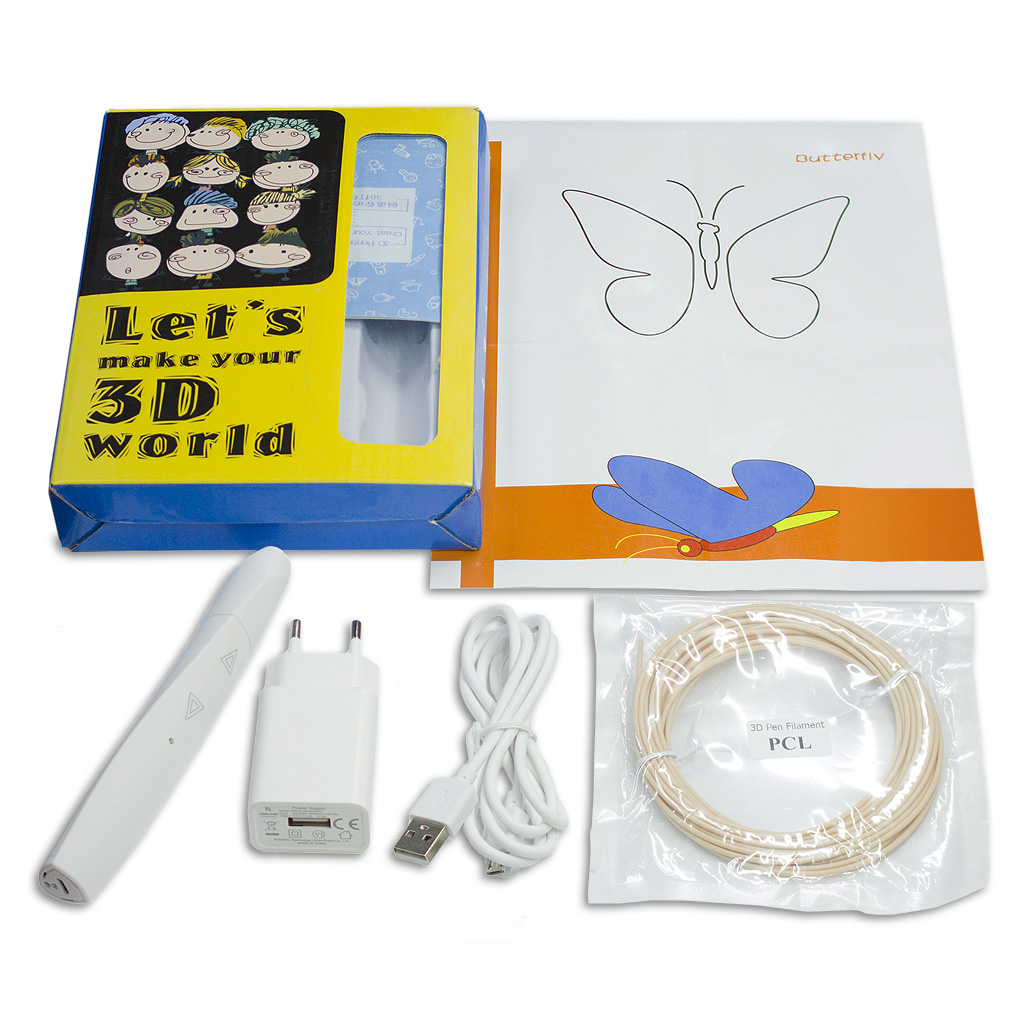 3D Ручка DW-D12 поддерживает функции ручной и автоматической подачи филамента. Предусмотрена возможность извлечения филамента для замены на нитку PCL-пластика другого цвета и автоматическая выгрузка в случае 2-минутного бездействия устройства. В комплектацию с этой великолепной ручкой входит стартовый набор из мотка PCL-пластика и бумажного трафарета с контурами нескольких частей от сборной 3Д-модели. Ручка поставляется вместе с сетевым адаптером 100-240В и UBS-шнуром, обеспечивающих возможность подключения 3Д-ручки D12 к обычной домашней электрической розетки или к портативной батарее (например, повербанк) с выходными характеристиками 5В / 2А.